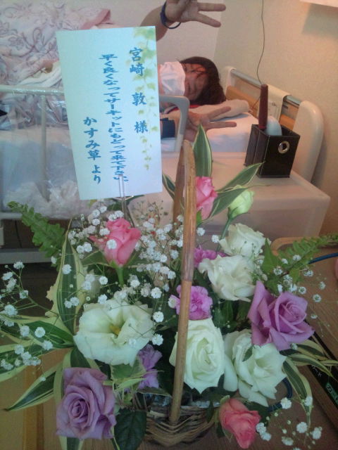 4輪レースドライバーの野田クンと、Speed of Japanの3人娘からお見舞いの花のプレゼントが届いた!