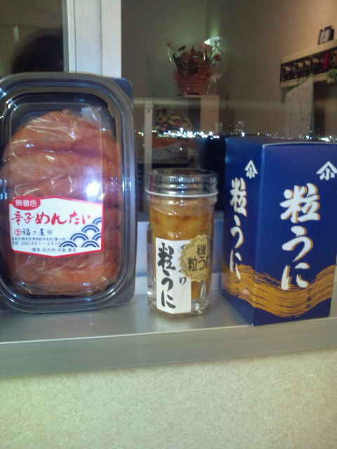 お土産は、好物の瓶詰めの粒ウニと九州の辛子明太子!