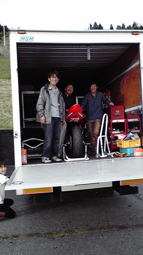 テストが終わって、坂井さんと銀色バイクのGP-MONOライダー岩本くんにも手伝ってもらってトラックに積み込み完了~!